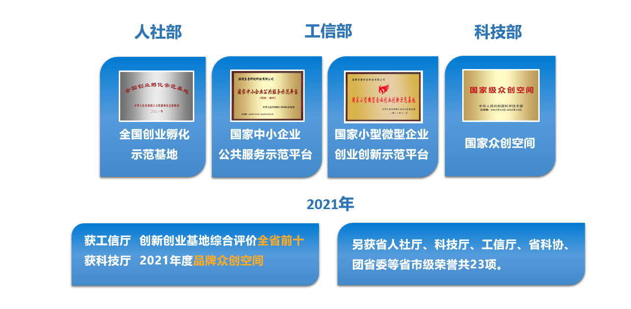 山东省青年创业孵化基地、山东省中小企业公共服务示范平台、山东省创业孵化示范基地、山东省小微企业创新创业示范基地、省级众创空间(周村区创业孵化中心)、山东省创客之家、山东省2019年全国科普日优秀活动、2021年度山东省小型微型企业创业创新示范基地综合评价前十、山东省五四红旗团支部、省级专家服务基地。